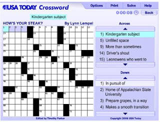 *Ok, so I'll be honest. Originally I wanted to do the New York Times puzzle because it seems smarter, has a better reputation, and probably provides a better education. Unfortunately, you have to pay for that one, and I'm just too cheap for that. I'll take the somewhat inferior freebie, thankyouverymuch, because really, I'm probably not intelligent enough to complete a Times puzzle. Like, ever.